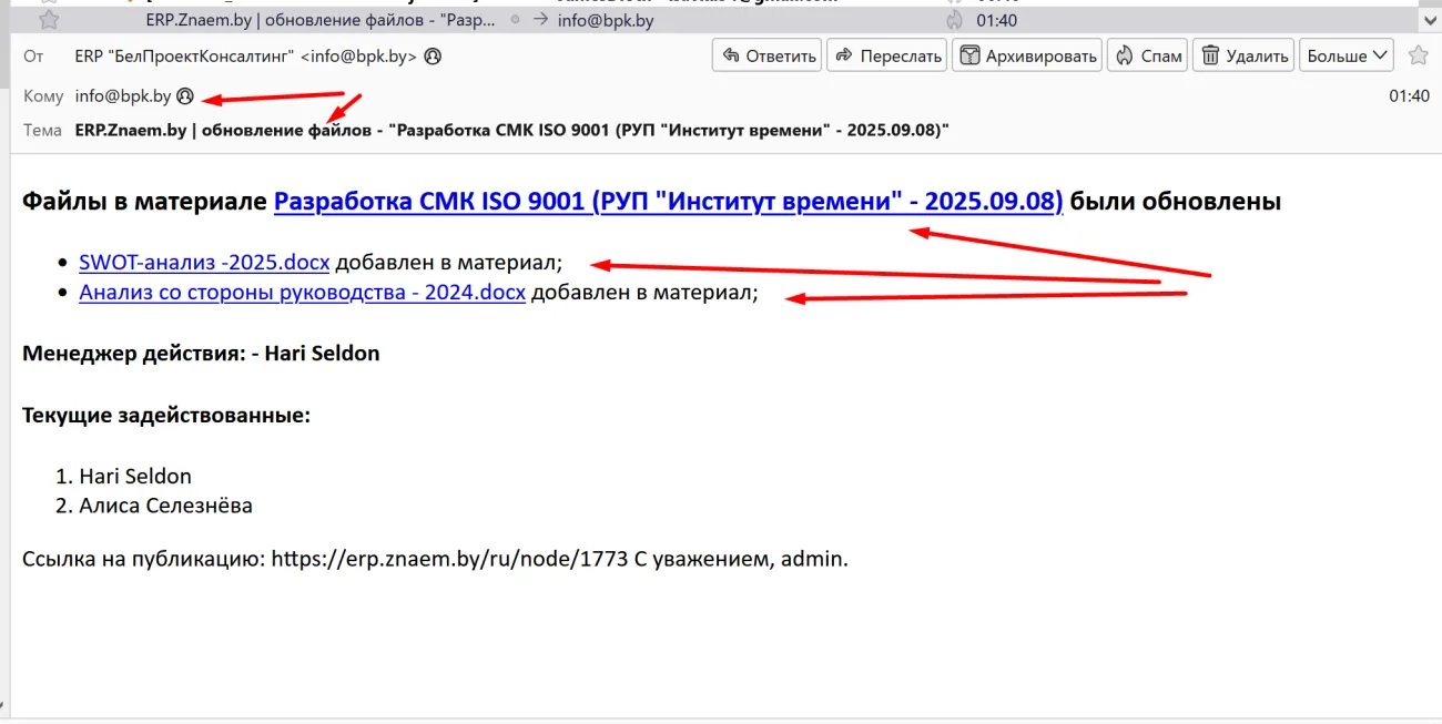 • На сайте ERP.Znaem.by опубликована подробная техническая инструкция, посвящённая работе с системой email-уведомлений. Инструкция описывает, как в системе настраивается автоматическое информирование пользователей о ключевых изменениях в действиях, задачах, проектах и других типах контента. Инструкция помогает разобраться в логике уведомлений и показывает, как использовать этот функционал для повышения командной информированности и упорядочивания обмена информацией. Email-уведомления позволяют участникам процессов своевременно получать информацию об изменениях без необходимости дополнительной пересылки данных.